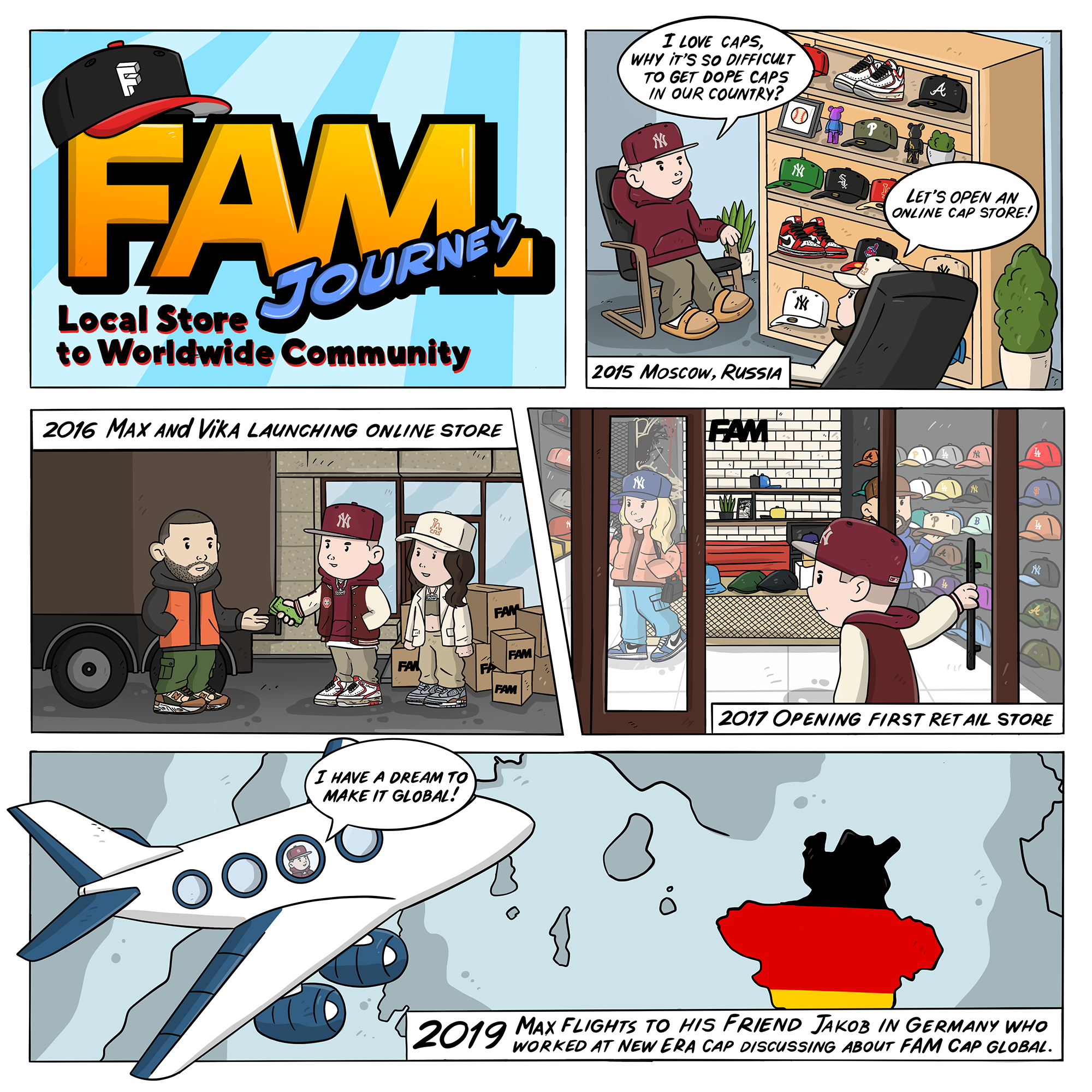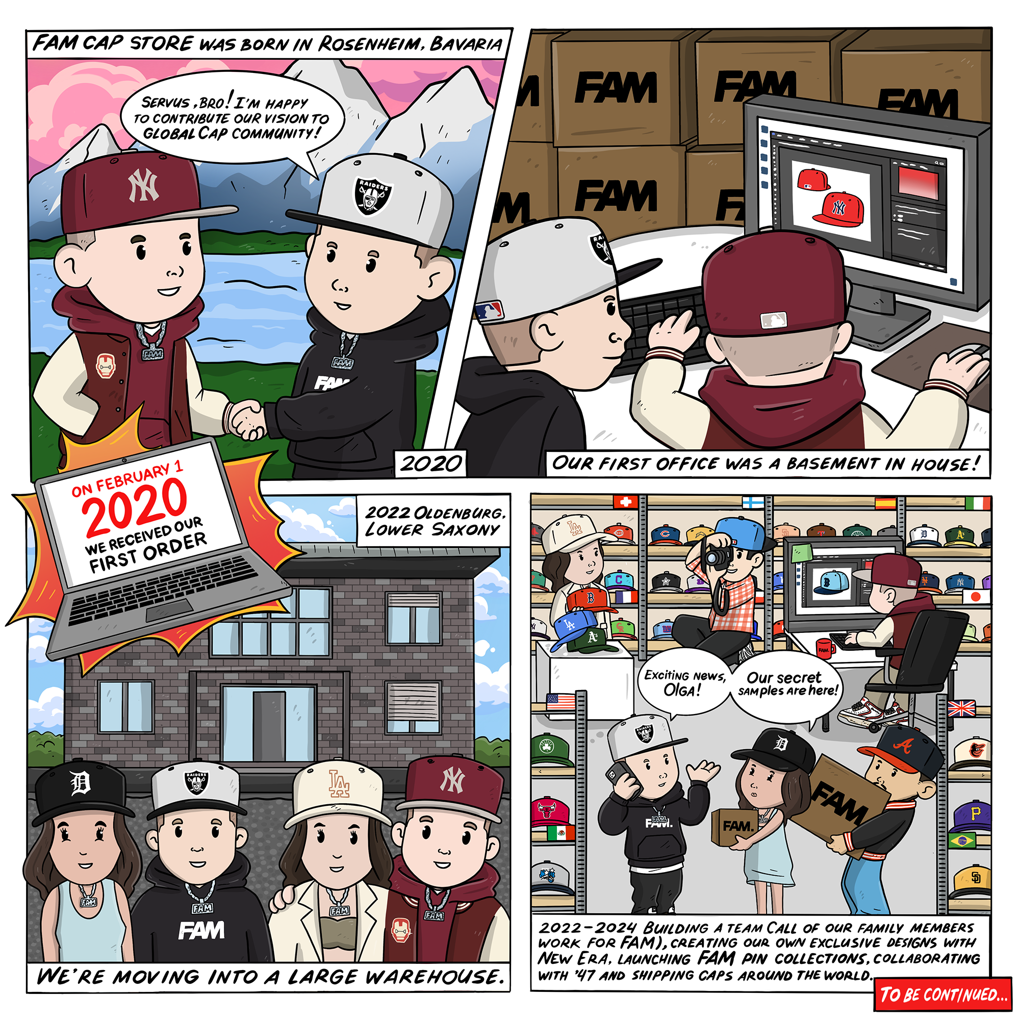 Aujourd'hui, le magasin FAM CAP est une boutique en ligne basée en Allemagne, qui expédie dans le monde entier. Dirigée par deux familles, nous travaillons en partenariat avec de grandes marques comme New Era et '47 pour vous offrir des casquettes spéciales. Nous concevons également des casquettes exclusives avec ces marques et créons nos propres pin's FAM pour ajouter une touche unique.